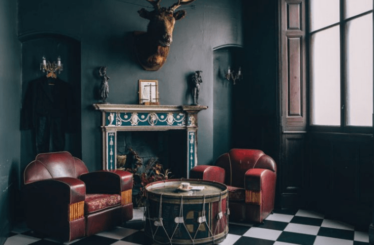 “We were inspired by an article we’d seen in Elle Decoration titled ‘The New Antiquarians’ and the parlour is very much inspired by that,” says Jason. “The lounge was easy, as the panelled walls lent themselves to a gentleman’s club theme, and then the antiques were sourced from Rachel and Mike who had two shops on North Street (now the two new sites from the Old Bookshop), as well as eBay and Dreweatt Auctions in Ashton. We then got wall coverings from William Morris and Cole and Sons. I love the view out from the lounge onto the stairwell, where you have the ornate stairs, chandelier, leopard skin and William Morris wallpaper.”