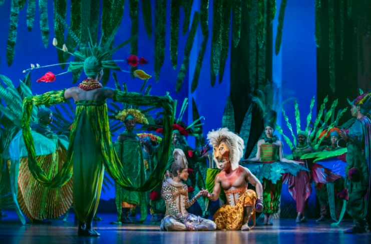 The distinction is in the details: the stage smoke used to create the look of savannah dust being whipped up beneath hooves during the wildebeest stampede; the shadow puppetry between scene changes; (spoiler) the streams of white-ribbon tears that the grieving lionesses pull from their eyes when their fallen king, Mufasa, is discovered; the movements of the dancers adorned with tropical leaves and doing a very convincing and amusing job as the jungle vegetation Timon and Pumbaa lounge among.